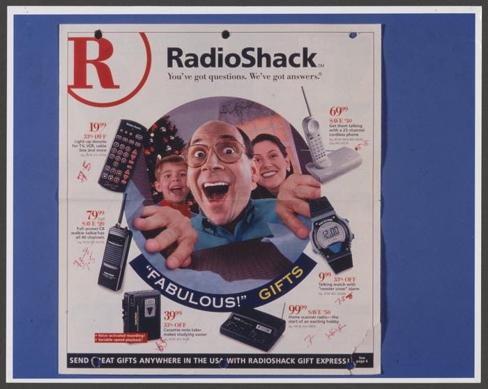 This was the 1980s and 1990s in suburban Long Island. I spent many aimless hours of my youth following him around the big-box stores of the time—PC Richards, CompUSA, RadioShack, Best Buy— hiding my face in embarrassment as he tried to haggle the retail price down on brand-new-to-the-market desktop computers, digital cameras, cordless phones, gaming consoles, speaker systems, and DVD players. Oh, and also multi-disc CD players, modems, and beepers, and definitely laser and/or inkjet printers. And probably everything else that ever came out ever.